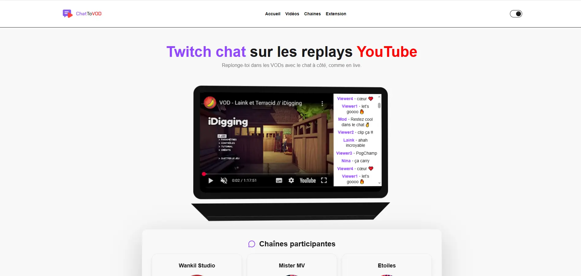 ChatToVod a été créé pour pouvoir visionner des replay de chat Twitch, sur le site ou Youtube, avec le chat. Le site est une vitrine mettant en avant ce service et permet aussi, via un onglet vidéo, d’observer directement via le site les vidéos avec le chat intégré. Le site propose également une extension chrome afin de pouvoir bénéficier automatiquement du chat sur Youtube lorsque on regarde une VOD ou un replay compatible. Le projet et encore en cours de développement. Notamment pour l’extension et son approbation par le google chrome store.