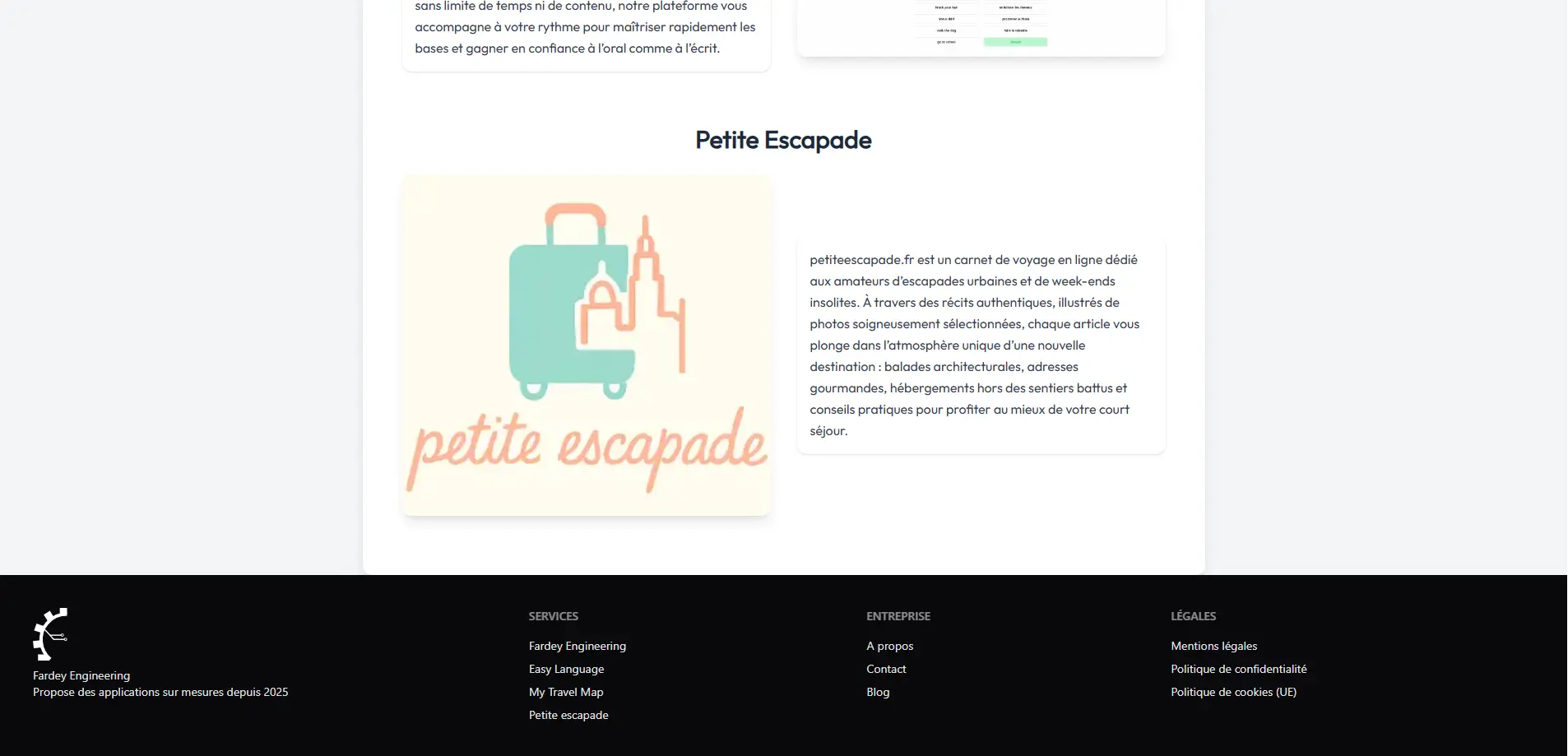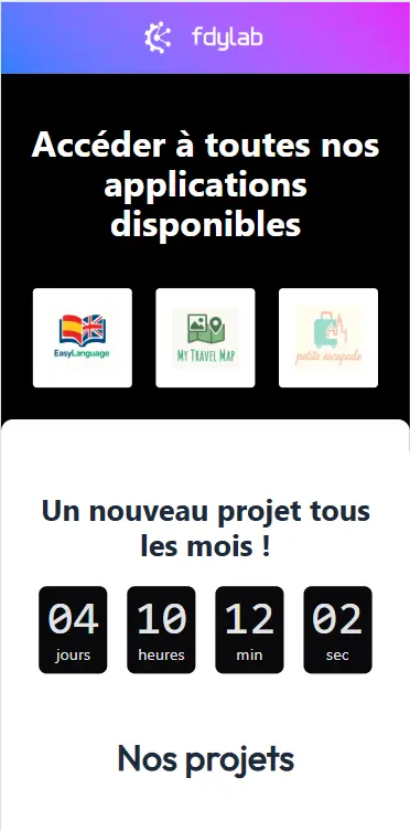 FdyLab est un site vitrine réalisé pour mettre en avant les applications développés par Fardey Engineering. Le site propose des applications diverses et variés allant de la création de carte photo de voyage, l’apprentissage de langue à la création d’extension pour navigateur. L’idée est de créé un nouveau projet tout les mois / deux mois en proposant de nouvelles idées / services.