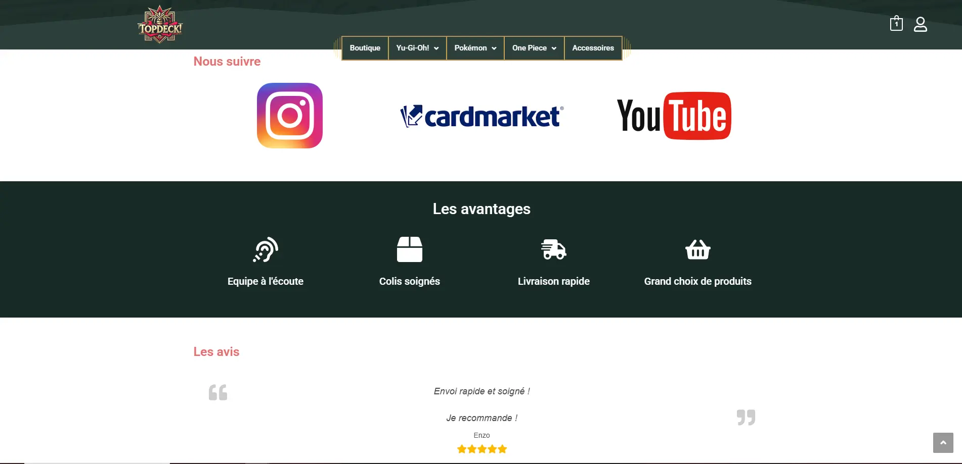 Top Deck Tcg est un site vitrine et une boutique en ligne réalisé pour mettre en avant l’activité de vente de carte d’un client. Le site propose la vente de carte yu-gi-oh, magic, pokémon que ce soit via des displays, booster ou carte à l’unité. Le site mets en avant les liens vers sa boutique CardMarket, où l’ensemble de ses références sont disponibles et commercialisé. Un loading screen spécifique à été développé en PHP suite à une demande client.